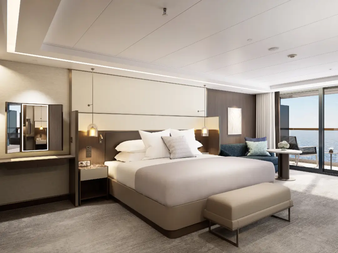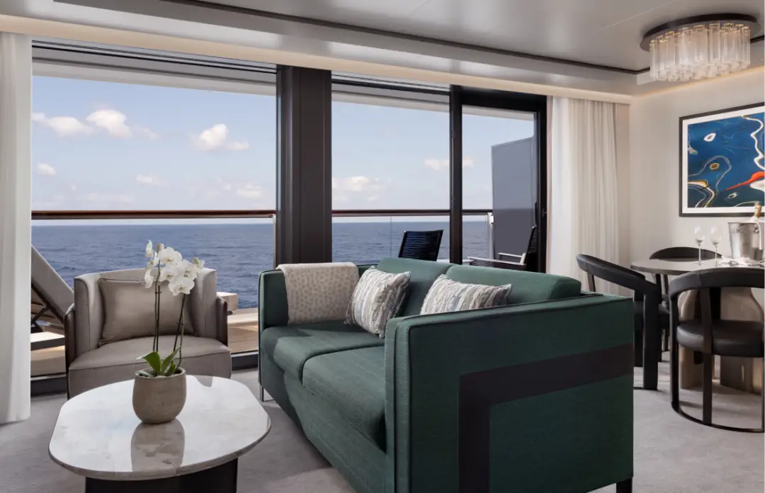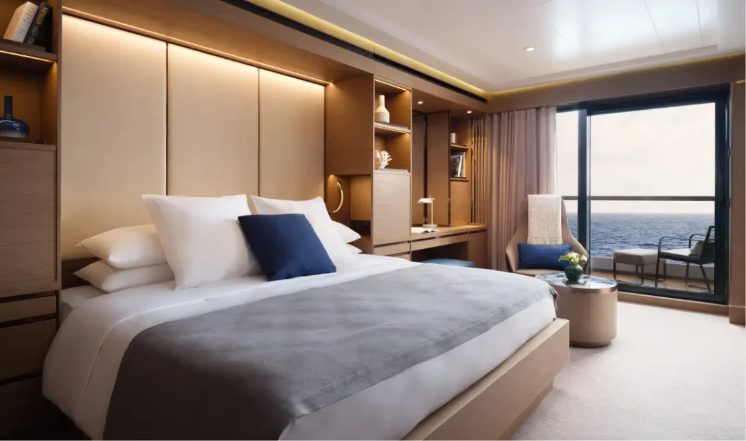宅邸套房:占地918平方英尺的室内空间,设有宽敞的落地窗,与156平方英尺的露台相连,宛如一座位于海上的私人宅邸。