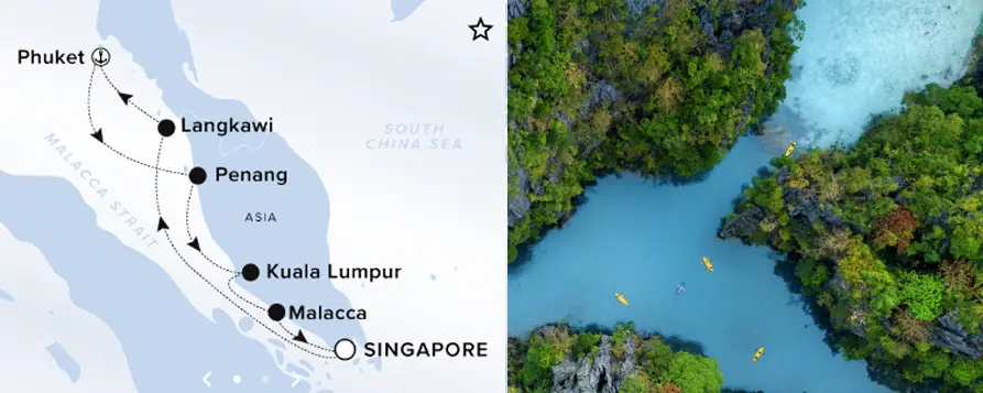 新加坡滨海湾金沙酒店壮丽的天际线、兰卡威天空之桥下雨林与海洋的壮阔景致、普吉岛安达曼海的迷人风光、槟城乔治市充满殖民风情的建筑和街头艺术、吉隆坡双子塔这座现代建筑的标志性地标、马六甲古城堡的历史韵味与夜市的美食诱惑,还有在邮轮上欣赏日落美景和水疗放松的体验,这些元素共同绘就了一幅自然、文化和休闲相结合的跨圣诞之旅画卷。