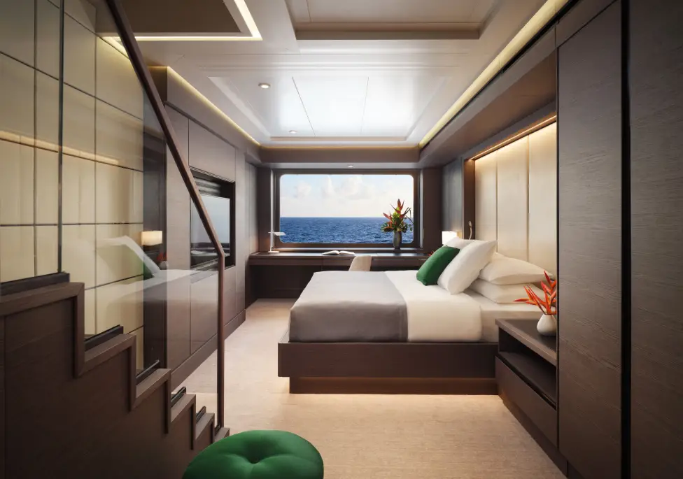 船主专属双层套房:室内面积达1,047平方英尺,附带1,048平方英尺的宽敞露台,且位于顶层,配备专属观星功能与按摩池。