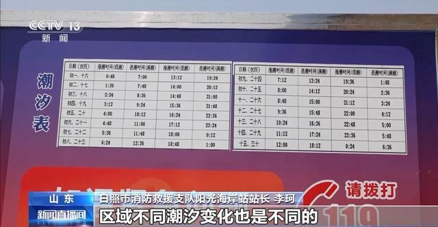 李珂,日照市消防救援支队阳光海岸站的站长提醒说,游玩海边前需留意潮水涨落情况。以日照市为例,该地每日有两次潮涨潮落,而不少沿海地区则是一日一涨一落,且各区域潮汐变化各异。游客在海边景区游玩时,可以向工作人员咨询,或通过海边公示的展板以及媒体应用程序来获取相关信息。