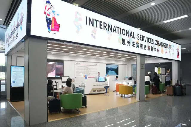 在5月20日这一天,新华社记者薛宇舸于张家界荷花国际机场捕捉到了境外来宾综合服务中心的景象。该中心为外国游客提供了货币兑换、交通资讯查询以及电话卡办理等服务。