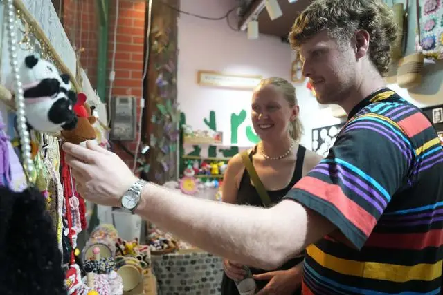 5月20日,在张家界市七十二奇楼景区,爱尔兰游客正在精心挑选各式各样的纪念品。新华社摄影记者薛宇舸现场捕捉了这一幕。