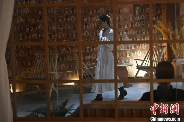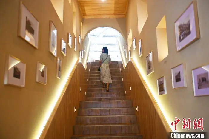 5月19日,在甘肃省敦煌市的敦煌印局,众多游客驻足欣赏着精心布置的敦煌照片墙。中新社的摄影师李亚龙现场捕捉了这一幕。