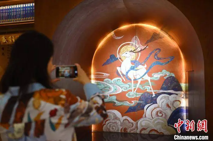 5月20日,在甘肃省敦煌市的敦煌书局,众多游客纷纷驻足,对仿制的九色鹿壁画洞窟进行参观与摄影。中新社的摄影师李亚龙记录下了这一幕。