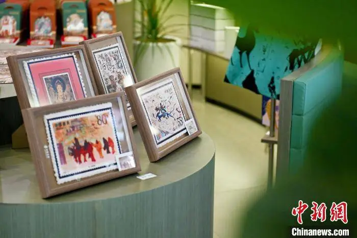 5月22日,甘肃省敦煌市的敦煌飞天主题邮局中,展示着一系列富有敦煌特色的邮票。中新社的摄影记者李亚龙进行了拍摄。