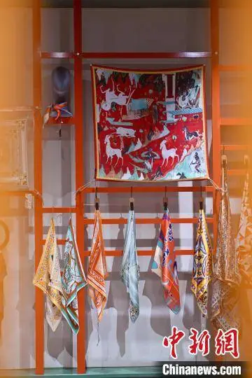 5月19日,在甘肃省敦煌市的敦煌印局,展出了各式各样的敦煌元素丝巾。这些精美的丝巾吸引了众多游客的目光。中新社的记者李亚龙先生对此进行了拍摄。