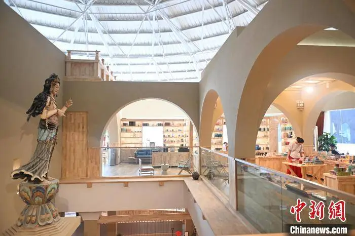 5月20日,甘肃省敦煌市敦煌书局内,游客阅读敦煌相关书籍。在敦煌书局,我偶遇了来自四面八方的“文化共鸣”,这解锁了当代人的社交基因;在敦煌印局,以“印”为纽带,我得以欣赏到五湖四海的“文化情书”;而在敦煌飞天主题邮局,那丝路古道上的思念仿佛随着“飞”向了全世界……“组局”这种新兴的聚会方式,在敦煌千年文化IP的加持下,正通过一系列“局”的形式,激活了社交的新模式。文旅市场的需求日趋多样化,敦煌市近期陆续开设了敦煌书局、敦煌印局、敦煌飞天主题邮局,同时还在筹备敦煌酒局,旨在持续满足游客对深度体验的追求。中新社记者李亚龙摄影。