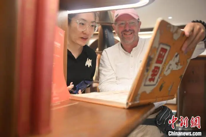 5月20日,在甘肃省敦煌市的敦煌书局,一位名叫彼得的欧洲游客(右侧)正与记者就敦煌文化的地域传播进行深入交流。这一幕由中新社记者李亚龙记录下来。