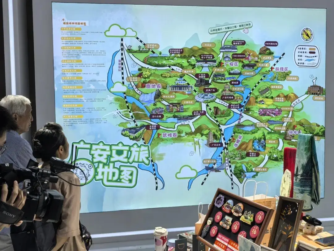 展馆两端精心设计的“文旅指南”最为贴心。今年我们首次推出了全新版的“广安市文旅地图”,一张地图便能全面了解广安的餐饮、住宿、交通、游览、购物和娱乐攻略。