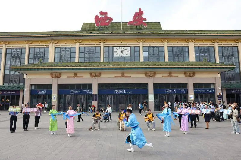 展演落幕之后,宣介团队迅速赶往西安火车站南广场,乌兰牧骑的成员们身着色彩斑斓的民族文化服装,通过精彩的歌舞表演和文化旅游推介,将康巴什的独有魅力生动呈现,使旅客在等待列车或出行途中,得以沉浸式地体验北疆的文化韵味与康巴什的旅游吸引力。