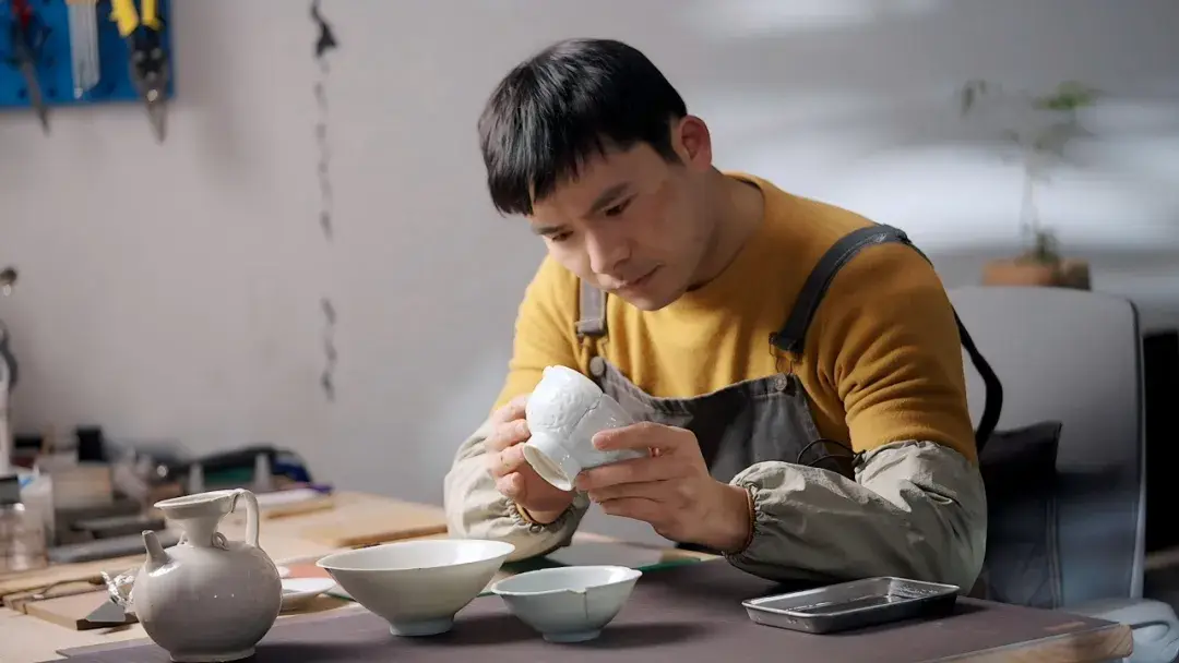 六位修复师聚精会神,紧握修复工具,细致地完成了青白瓷文物的碎片清理、碎片拼接、补缺复形以及上色打磨等一系列修复工作。当这些古老的青白瓷在现代化的镜头前再次焕发光彩,我们得以清晰地洞察到文物修复背后所蕴含的严谨科学原理:如何精准配比不同材质的粘合剂,既确保其强度又不损害文物本身,以及3D扫描建模如何精确地还原缺失部分的形状。尤其是,我们深刻体会到那些修复者对历史的敬仰之情,以及他们坚守文化传承的坚定意志。在青白瓷的釉色穿越时光与今人交流之际,修复者所用的工具正描绘着一段段新的文化传承故事。