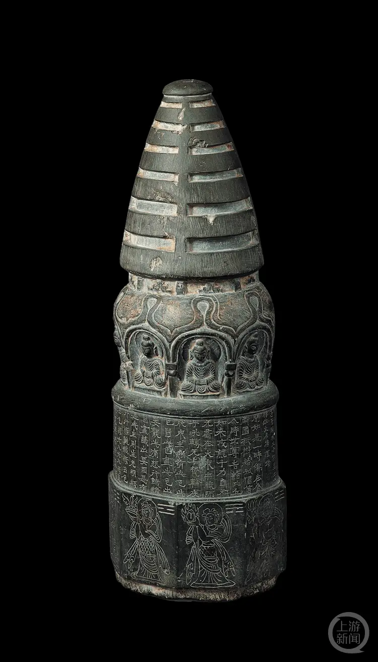 高善穆石塔实为一大亮点。这座石塔铸就于公元428年,堪称我国现存最早的佛塔实物。此次展览在重庆地区尚属首次。石塔整体高度为44.6厘米,底部直径15.2厘米。塔身由黑色玄武岩构成,尽管历经千年风雨,依旧光彩照人。