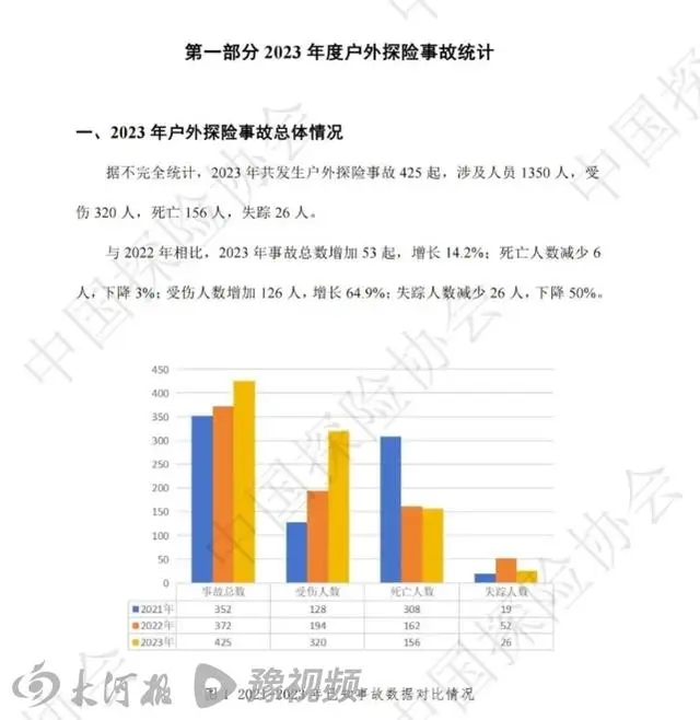 《2023年度中国户外探险事故报告》由中国探险协会发布,报告指出,不完全统计数据显示,2023年户外探险领域共发生事故425起,涉及人员1350名。其中,320人受伤,156人不幸遇难,26人下落不明。相较2022年,事故总数上升了53起,增幅达到了14.2%。具体到事故发生地,山地事故占了总数的50.8%,共有216起。分析事故项目分布情况,我们发现登山与徒步活动引发的事故数量高居不下,其中登山事故达156起,徒步事故则有83起,这两类事故共占事故总数的56.2%。