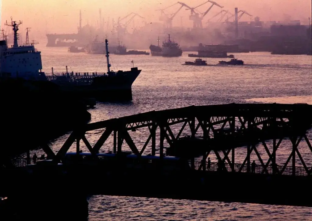 我最憧憬的是站在外白渡桥之上,远眺江面上形态各异的船舶,来来往往。亦或乘坐轮渡,聆听汽笛声声,体验江水的波涛起伏,观赏岸边巨大的吊车和令人惊叹的工业设备,这些浦江景象在我儿时的记忆中留下了深刻的印记。
