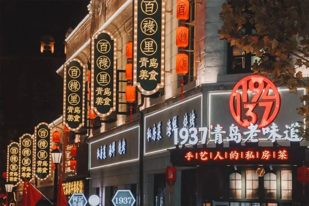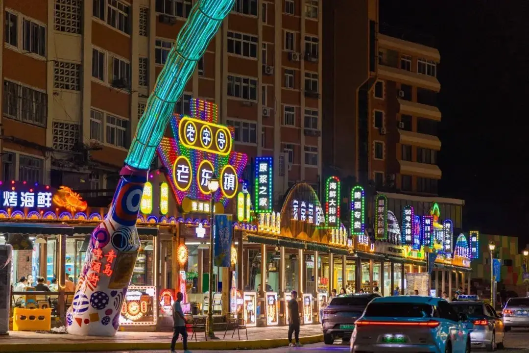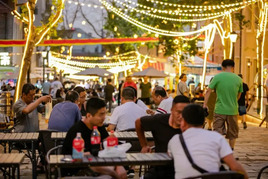 登州路啤酒街的霓虹灯闪烁,扎啤杯相碰发出清脆的声响,海鲜烧烤的香气弥漫,整个城市仿佛沉浸在一场热烈的狂欢之中,宛如一部欢快的交响乐章。