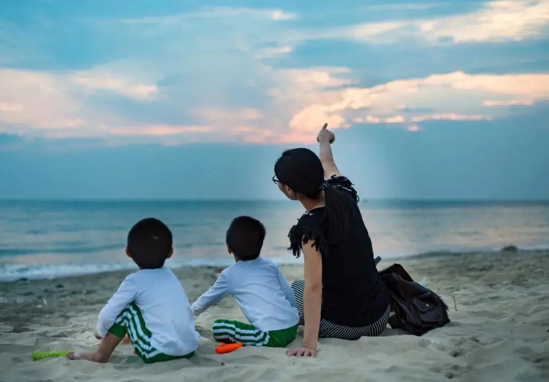 在海水浴场,穿着脸基尼的阿姨们以五彩斑斓的头饰诠释着潮流,沙滩上,孩子们嬉戏着追逐着海浪,欢声笑语与海涛声交织成一片。