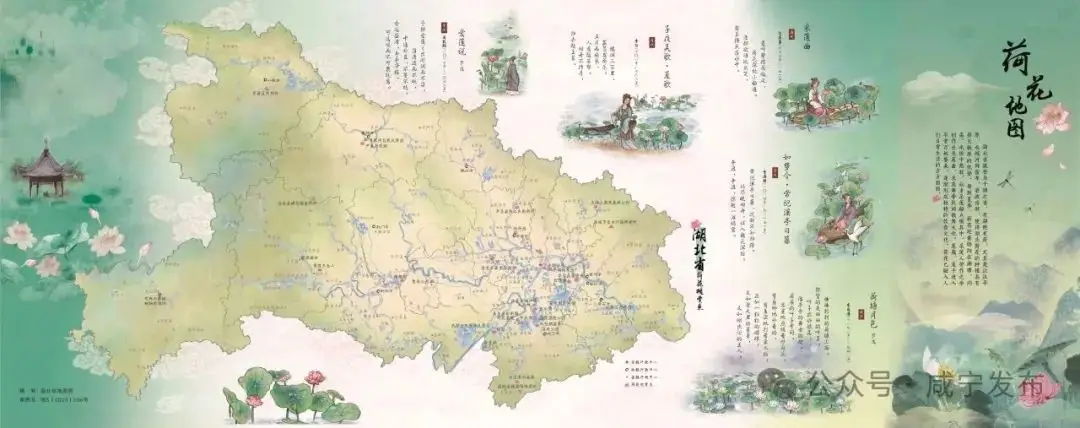 据了解,湖北省被誉为千湖之省,这为其荷花的种植提供了极为优越的自然条件。夏日炎炎,荷花在湖泊、沟渠、水田等地尽情绽放。湖北省地图院最新推出的《荷花地图》以荷花为核心,以绿色为整体色调,巧妙地将中国水墨淡彩画与西式水彩相结合,呈现出一种新颖的中式水墨漫画风格,生动地展现了湖北夏季荷花的迷人风光。