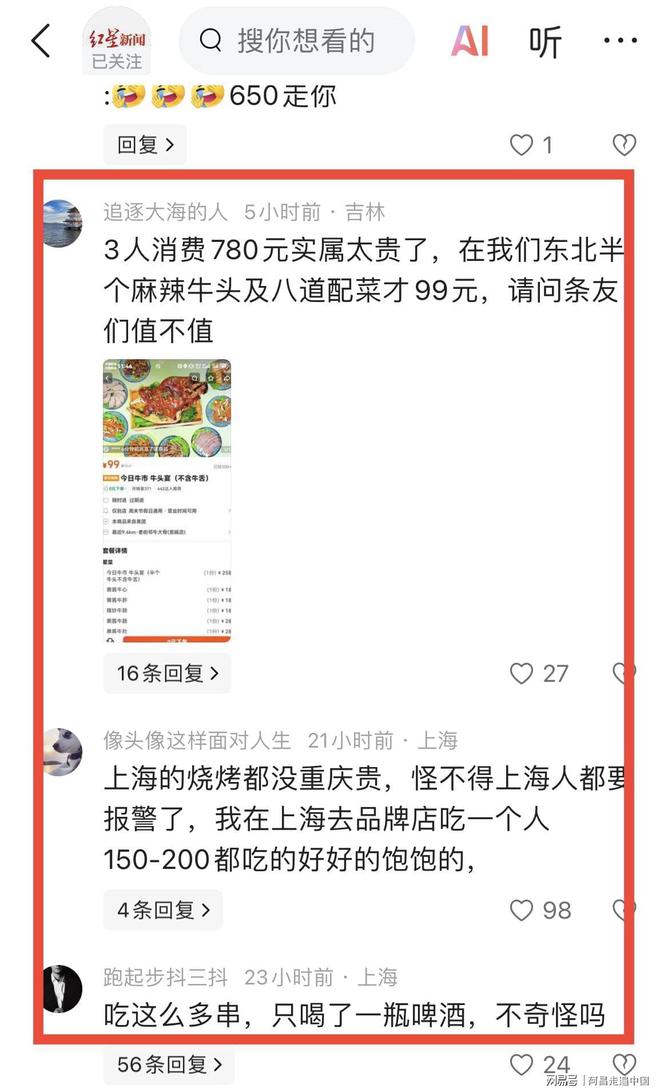 上海的烧烤价格比重庆便宜,这也难怪上海人会感到不满,以至于纷纷报警。我在上海知名店铺用餐,单人消费150到200元就能吃得非常满足,饱饱的。