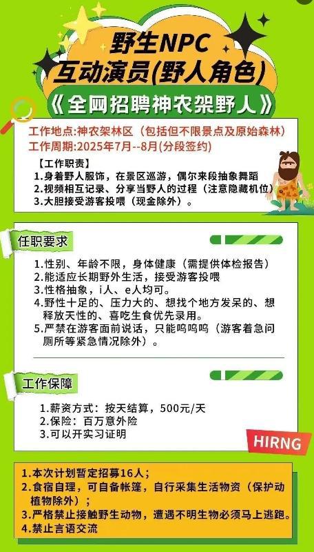 神农架景区招聘野人NPC引热议,日薪500元,你怎么看?