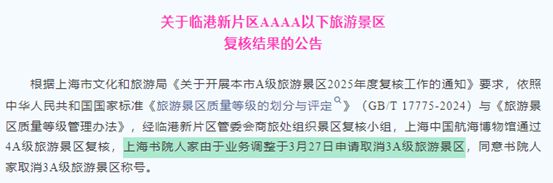 近期,上海书院人家因业务调整,已于3月27日向相关部门提交了撤销其3A级旅游景区资质的申请。