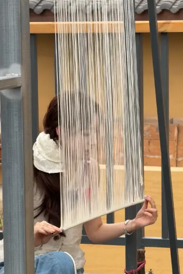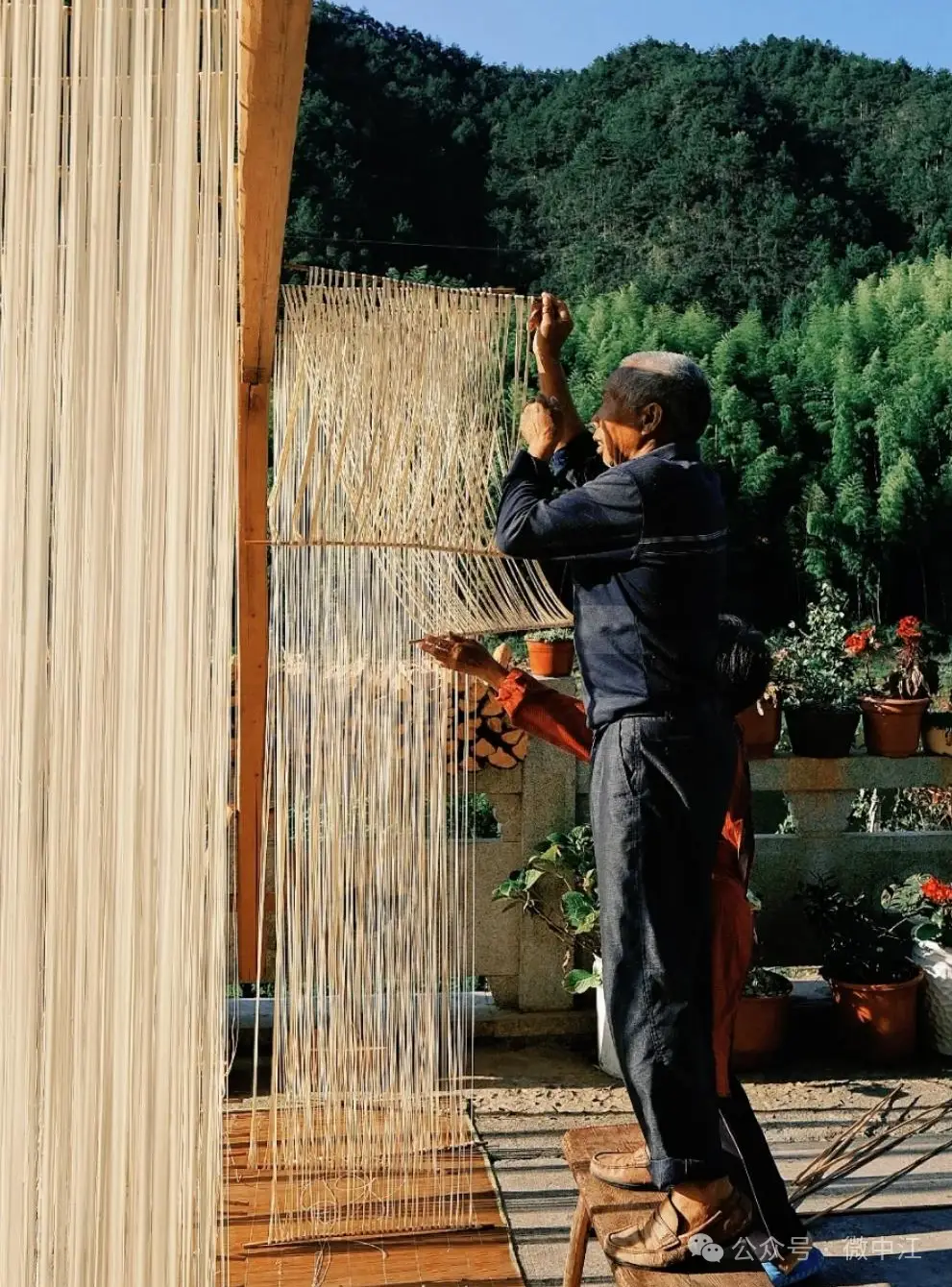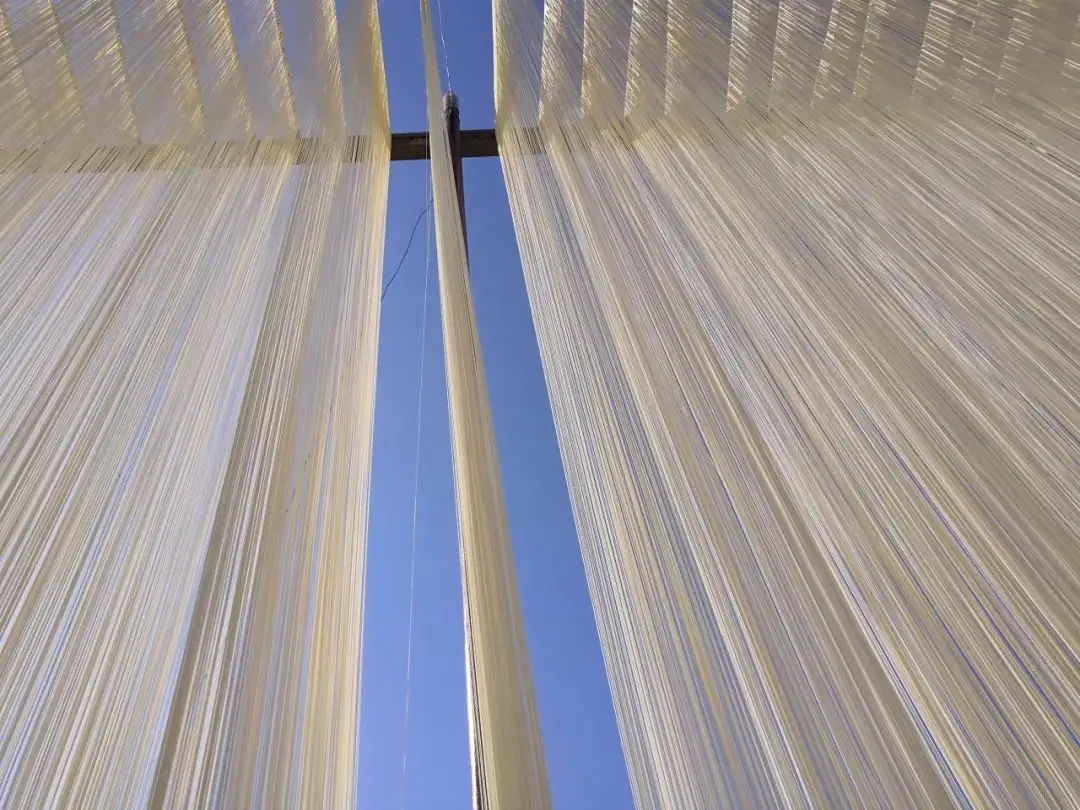 木架高达五米,上面悬挂着细如发丝的挂面,它们如同门帘般低垂,随着阳光的照射,轻轻随风摇曳,仿佛在传递着来自大自然的微妙信息。
