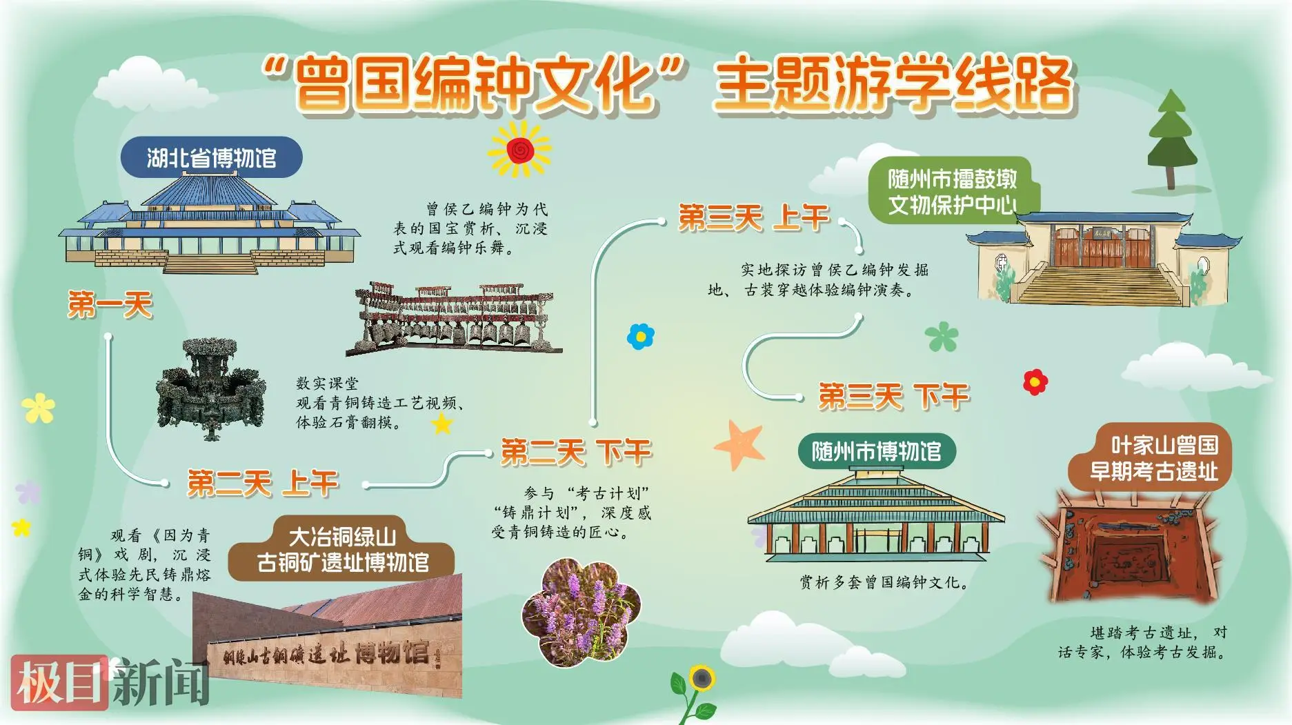 极目新闻记者得到消息,该线路以世界记忆和湖北省博物馆的镇馆之宝——曾侯乙编钟为核心,借助“博物馆+”的发展策略,将湖北省博物馆、铜绿山古铜矿遗址博物馆、随州擂鼓墩文物保护中心、随州市博物馆以及叶家山西周曾侯墓地等众多文化机构和文化地标串联起来,引领公众踏上一场穿越时空的探险之旅,深入探寻曾国编钟所蕴含的科技智慧和文化奥秘。