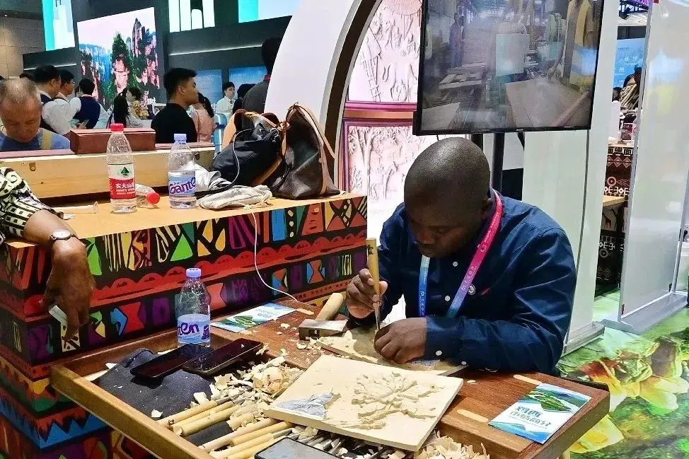 在刚果(布)的展位处,一位非洲的手工艺人正在展示木雕技艺。这位手工艺人是来自浙江广厦建设职业技术大学的刚果(布)留学生。自2018年以来,浙江广厦建设职业技术大学在“一带一路”倡议的框架内,已开始接纳刚果(布)的学生来校学习木雕技术。卢天豪,该校的一名留学生,向记者透露,他期望在我国的学术交流中,将我国独特的木雕技艺与刚果(布)的木雕传统风格相融合,创作出优秀的艺术作品。