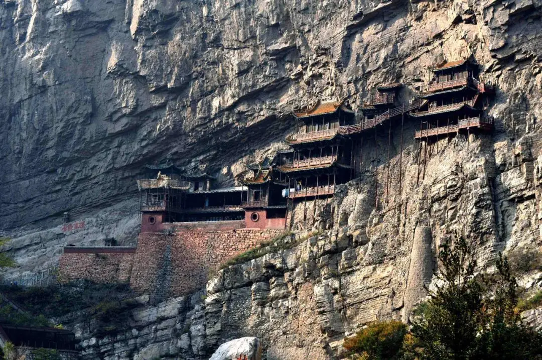 “悬空寺”位于恒山险峻的峭壁之上,堪称建筑一绝,它通过十几根木梁巧妙地悬挂在岩石缝隙之中,是一座历经千年的古老寺庙。李白曾亲自题写“壮观”二字,但这仍无法完全描绘出它那令人心魄震颤的雄伟与美丽。