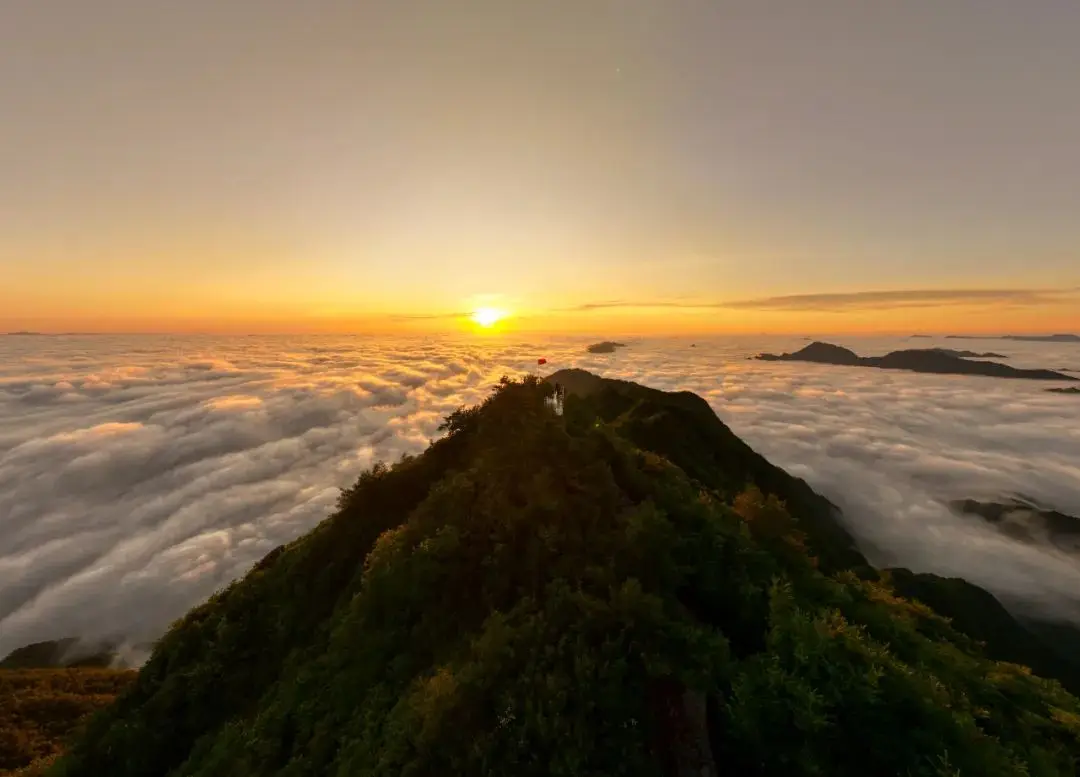好风岭之巅,风口之处,长风猛烈,放眼望去,山川美景尽收眼底;日出时分,霞光万道,云海似金水倾泻,震撼人心。