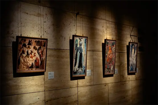在展览的壁画复刻区域,世界非物质文化遗产传承者李东方运用珂罗版技艺,成功重现了壁画的灵魂。《千手千眼观世音》呈现了佛教艺术的优雅,《莫高窟57窟的美人菩萨》映射出唐代华美多元的文化韵味,《飞天》则生动地描绘了敦煌飞天独有的气质与精神。堪称最壮观的,乃是非物质文化遗产敦煌石粉彩绘技艺的传承者王亚林所创作的长达26米的巨幅画作《鹿王本生图》的复制品。王亚林和他的团队恪守着“始终使用天然颜料”这一宝贵的理念,完美地再现了壁画的原色、质感、纹理,以及蕴含其中的自然哲理。在这些历经风沙洗礼的“时空见证”中,天然颜料所独有的色彩调性,成为了解开中华美学基因密码的关键。
