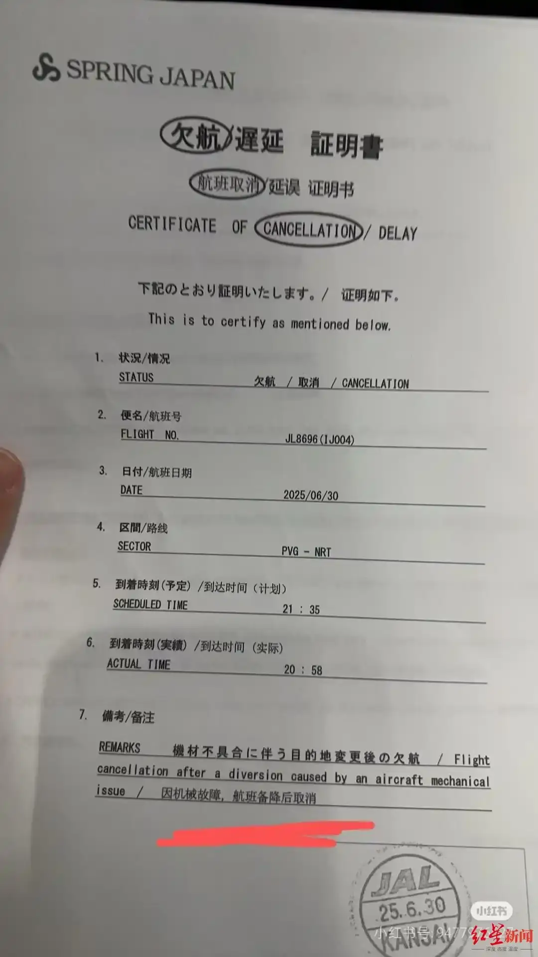 一些游客所发布的航班延误凭证上,标明由于设备问题导致航班延误并最终被取消。信息来源:红星新闻。