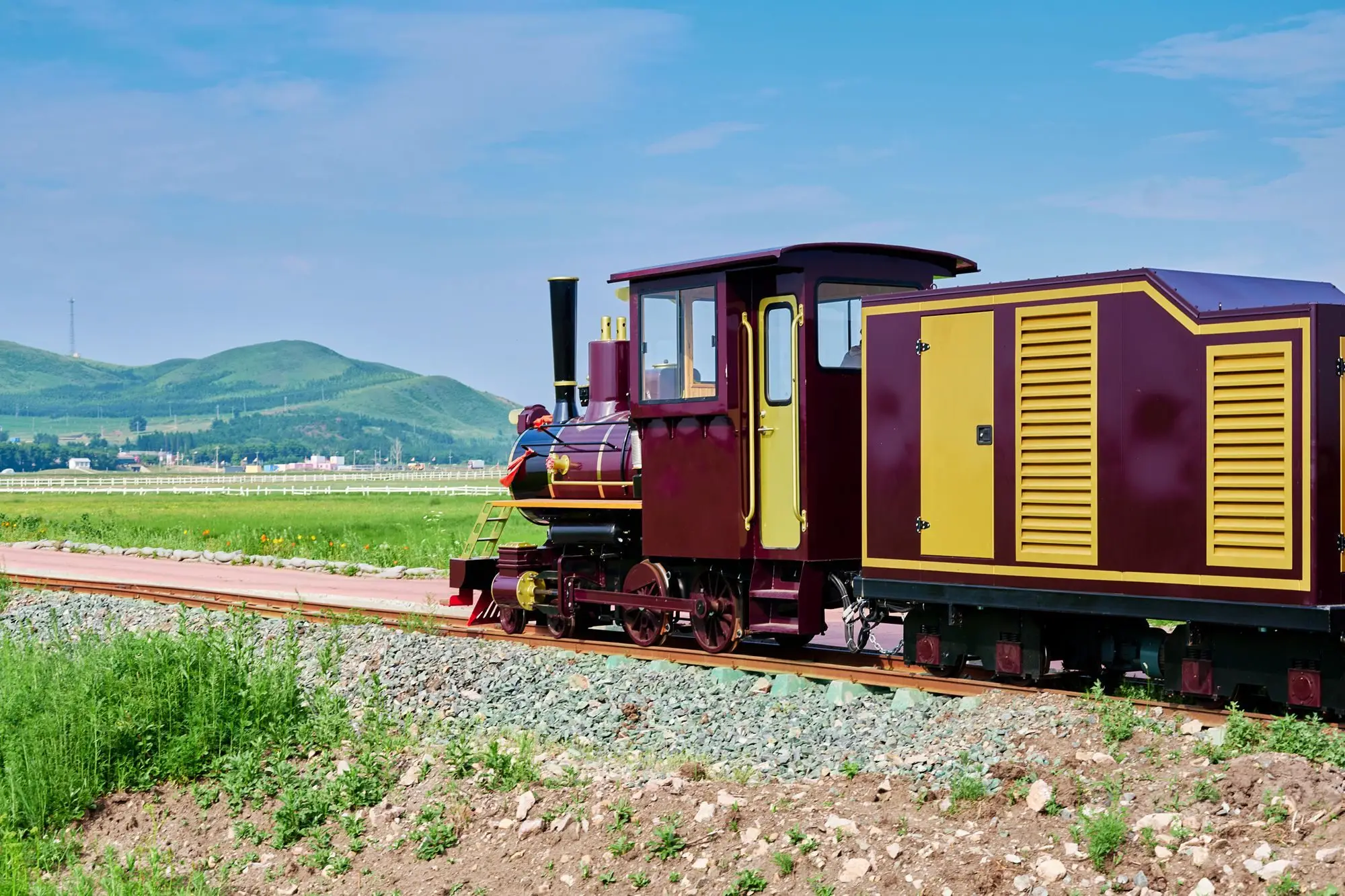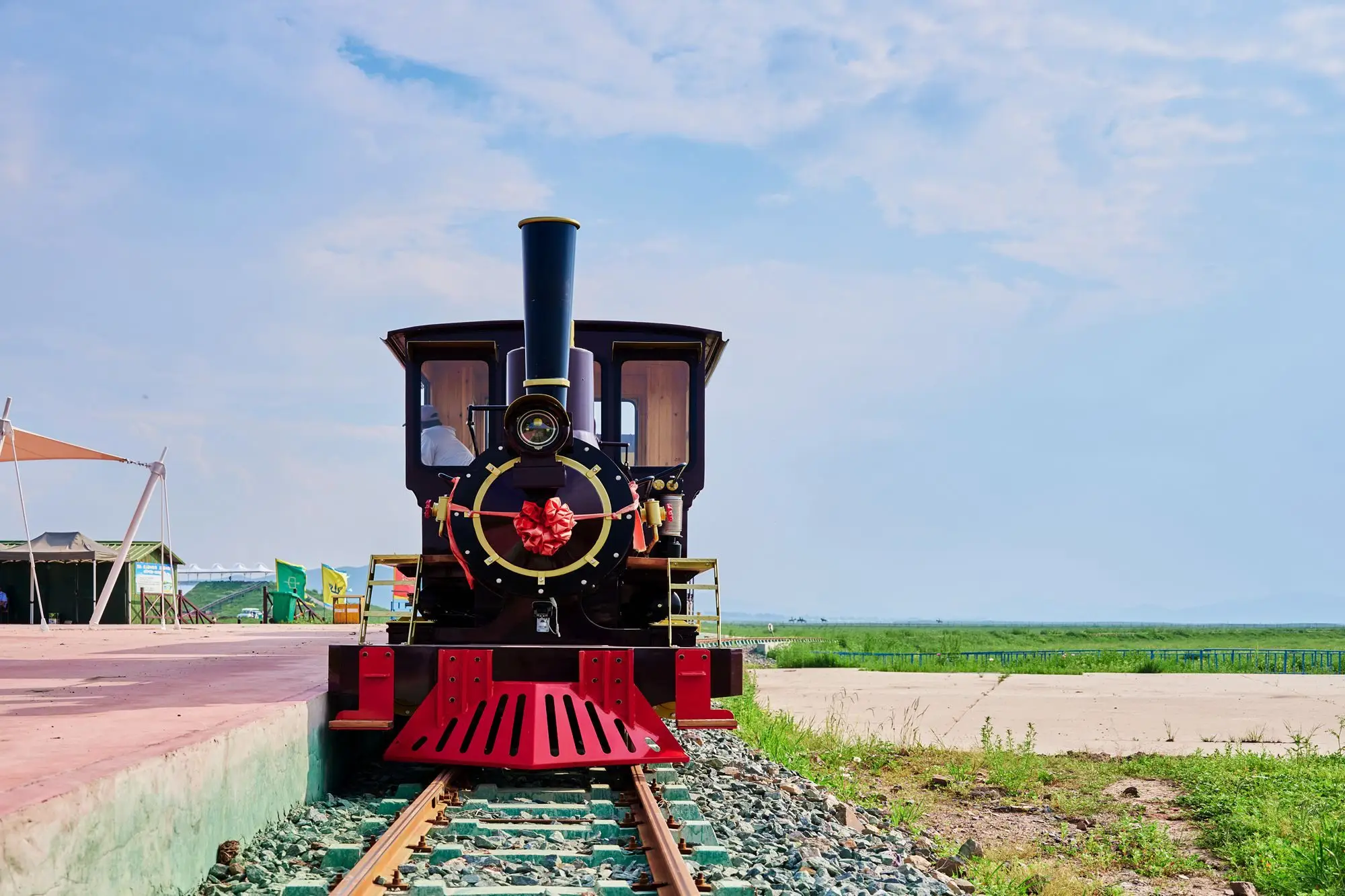 景区内的渡船火车以红色和黑色为主色调,烟囱高耸入云,复古风格十分鲜明,乘坐此车可直接深入草原腹地,达到一片清凉而宁静的所在。