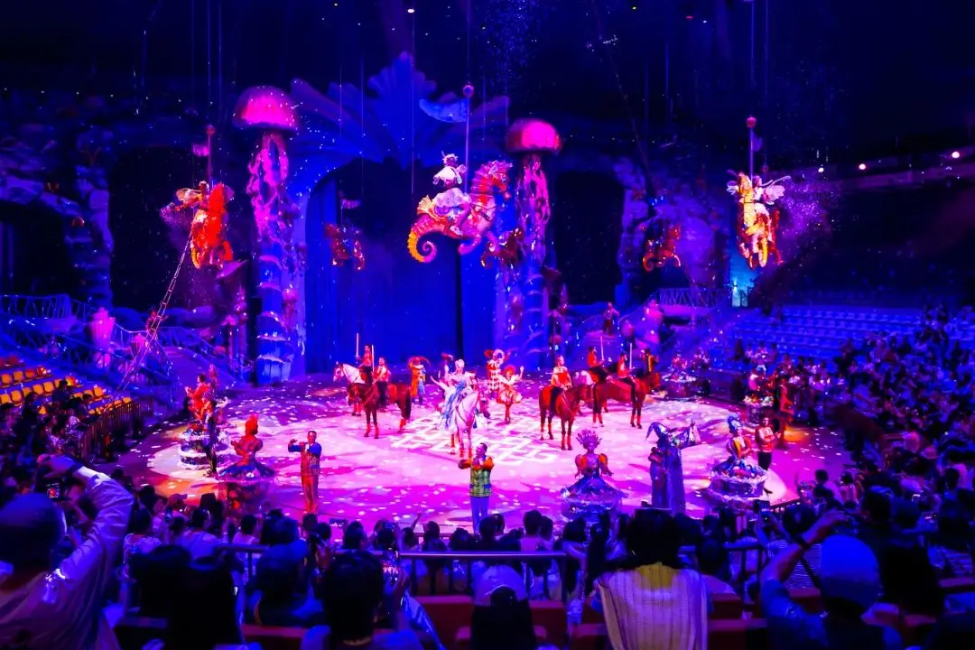 夜幕低垂,精灵驾驭着闪烁的荧光海马轻盈降临,王子与公主踏过梦幻般的蓝色拱门,往日的城市空白之地变成了充满多巴胺的乐园,一支国际顶尖团队带来了令人震撼的表演,惊险的马术、高空杂技、奇幻大秀以及互动巡游等节目依次亮相。