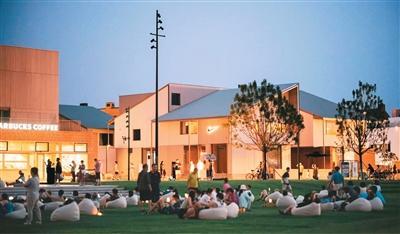 游客在秦皇岛阿那亚社区内的街区广场上休闲。