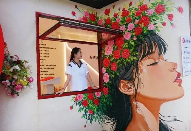 五一路婚姻登记点附近的墙上,两幅色彩斑斓的画作映入眼帘,以盛开的花朵为背景,与前来办理登记手续的情侣们共同描绘出一幅充满暖意的画面。这幅作品传递出一种美好的寓意,那就是画中的爱情如同盛开的花朵般永不褪色,花朵永远盛开不败。