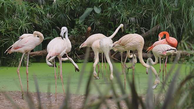 此外,为了使游客能够全面感受湿地鸟类的生活画卷,云南野生动物园特意增设了火烈鸟餐厅的观景平台。在七月,刚抵达云南野生动物园的非洲火烈鸟选择在餐厅附近的湿地栖息,游客在享用美食之际,也能将周围的美景一览无余。