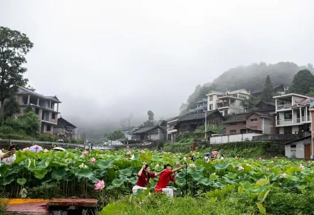 栗溪村原本隶属于寨阳乡,经过行政区划的调整,它被纳入了石家冲街道办事处的管辖范围。据同伴所言,我们如今可以被称为“城里人”了。该村划分为三个自然寨,分别被称作一、二、三组。行至二三组之间,忽闻一阵欢声笑语,我们的视线不由自主地被那不远处的一片荷田所吸引。原来,一对年轻恋人正在荷田边游玩并拍照留念。女青年试图摘取一朵荷花,却不慎陷入泥泞之中。看到她略显愠怒的神情和男青年那既好笑又尴尬的表情,我们也忍不住笑出了声。这片占地百亩的荷田,宛如大自然的杰作,为这个美丽的小山村增添了无限光彩。初夏时节,荷叶层层叠叠,宛如一片碧波荡漾的绿海,微风拂过,荷叶波动,宛如在轻声讲述夏日的传奇。荷花在这片翠绿之中傲然挺立,有的还未完全绽放,宛若含羞的少女;有的已经完全盛开,粉嫩的花瓣轻轻展开,宛如身着盛装的仙女在风中翩翩起舞。荷叶上的水滴不断滚动,散发出诱人的光辉,一片挨着一片,宛如为荷花撑起一把绿色的伞,微风吹拂下轻轻摇曳,用“接天莲叶无穷碧,映日荷花别样红”这句诗来形容再合适不过。蜻蜓在花丛中翩翩起舞,时而落在花蕾之上,时而振翅高飞。身着五彩斑斓服饰的网络红人们,镜头前或高声歌唱,或优雅起舞,与田边嬉戏的民众共同为这美景注入了更多生机与活力。