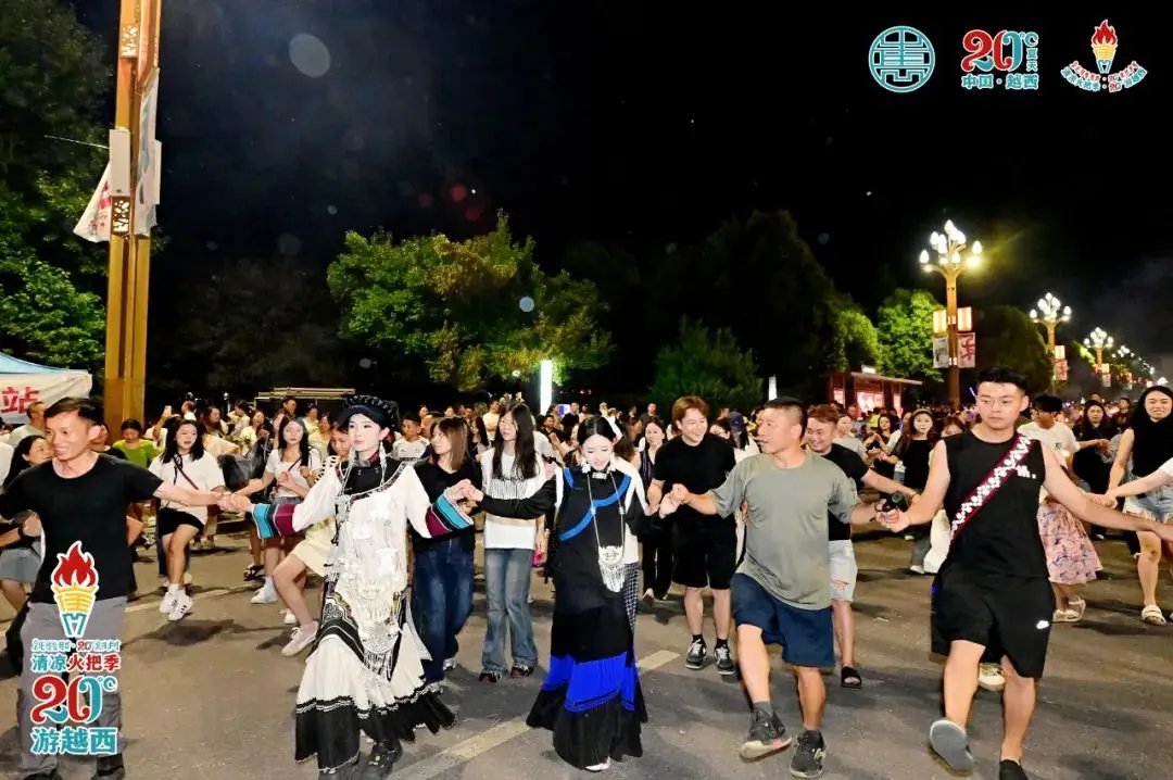 在火堆边,游客们手持火把,火焰摇曳生姿,仿佛驱散了周围的阴沉,将整个嶲州城映照得明亮。火光映射出他们喜悦的面容,身着色彩斑斓民族服饰的彝族舞者们围绕着篝火,随着音乐的节拍跳起达体舞,激情四溢地引领着现场的游客们一同欢快地跳起达体舞。众人手挽手,跟随节奏尽情舞动,沉浸在节日的热烈氛围之中。火舌翻飞,将源自越西的炽热情感具体呈现,星光映衬下,文昌大道两旁形成了一片浩瀚的火海,火焰与人潮交融,欢声笑语持续不断。