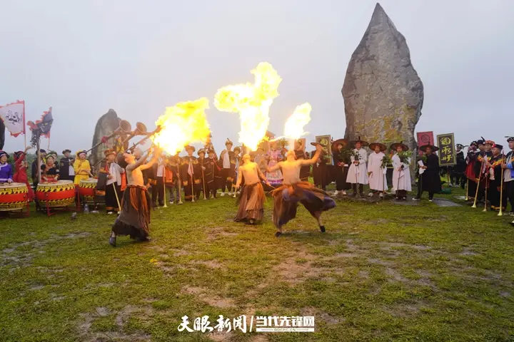 方家坪景区的巨石阵中,彝族民众吹奏起悠扬的长号,布摩们齐声吟唱着古老的《取火经》,他们虔诚地尝试着钻木取火。火把在众人期待的目光中成功地点燃,取火者将火把高高扬起,周围的群众也跟着跳起了传统的祭祀舞蹈,场面热烈,象征着风调雨顺和民族的繁荣昌盛。