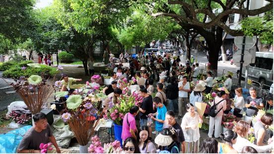 清晨时分,白塔西路的青石板路上,夜露的凉意犹存,巷口处荷叶的香气四溢。75岁的陈如珍将最后一束荷花递给了身着汉服的姑娘,竹筐中的莲蓬沾满了水珠,宛如一串碧绿的小铃铛。“十五块六朵,另送两个莲蓬!”她的叫卖声与游客的拍照声交织在一起,在粉白相间的荷花丛中回荡。这个起源于农特产品临时疏导点的集市,现已成为苏州夏日最具魅力的景观——从太湖东山的荷花塘延伸至古城的街巷,从阿婆手中的竹筐到游客的相机镜头,一朵荷花所连接的,不仅仅是古城的繁华与诗意,更是一条清晰可见、触手可及的增收之路。