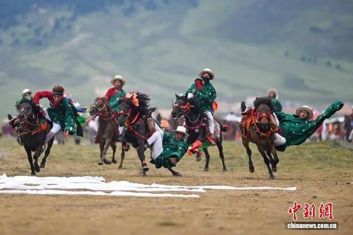 理塘县毛垭草原上牧民们展示马术技艺。记者刘忠俊摄