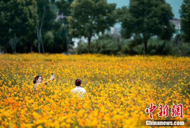 荻浦村的广阔花田带来了一份额外的喜悦:由众多花朵编织而成的美丽花毯,使得“孝义第一村”的悠久牌坊,成为了年轻人相机下的趣味漫画背景。