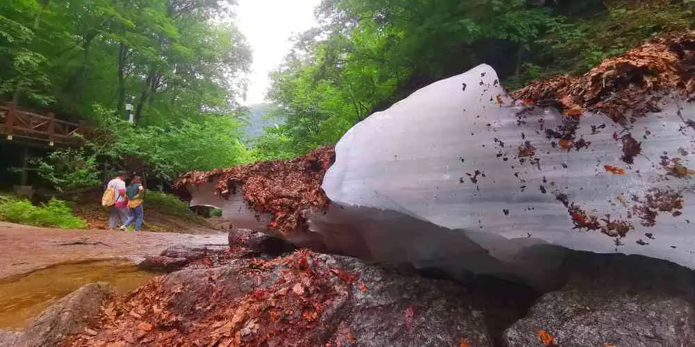 景区工作人员解说,大冰沟森林公园位于中温带低海拔区域,呈现峡谷地形。冬季,山间泉水凝结成厚实的冰层,直至次年8月才彻底融化,造就了夏季的“冰瀑”奇观。游客漫步于森林公园,无不为之“左手盛夏右手冬”的奇妙感受所折服。