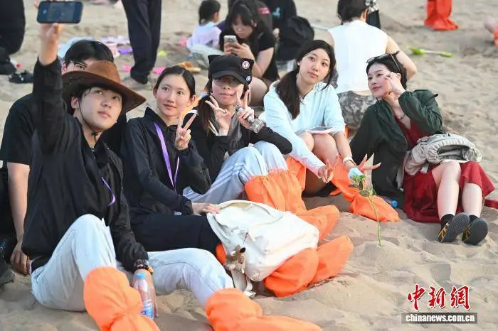8月1日,甘肃省敦煌市的鸣沙山月牙泉景区迎来了一家人,两岸的子女们在此共度欢乐时光,纷纷合影留念。中新社记者李亚龙记录下了这温馨的一幕。