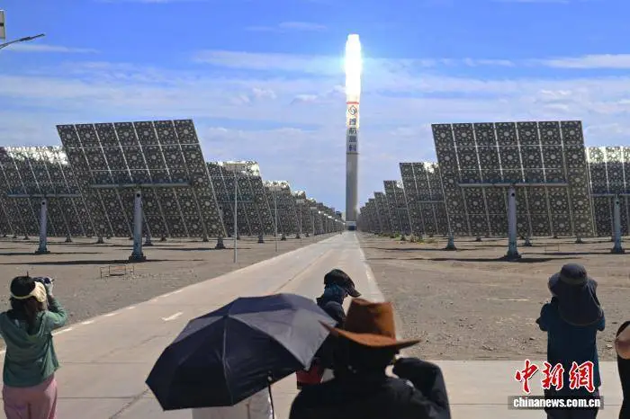 8月1日,甘肃省敦煌市,两岸婚生子女暑期研学活动成员参观拍摄敦煌首航高科熔盐塔式光热电站。中新社记者 李亚龙 摄