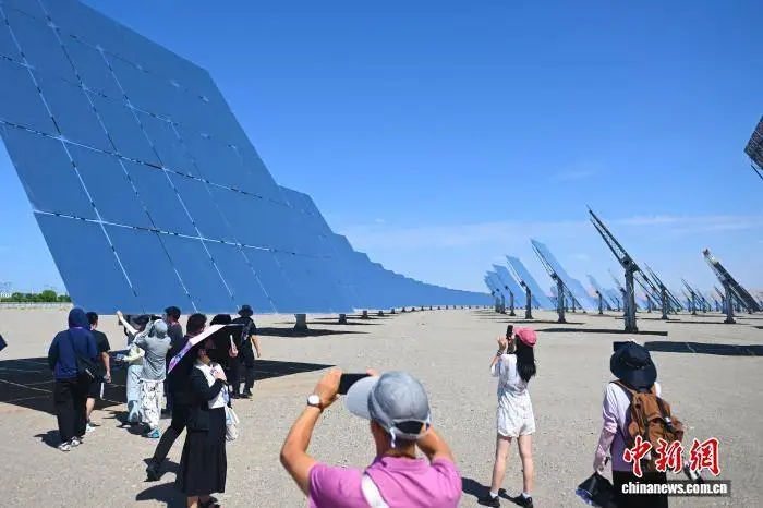 8月1日,在甘肃省敦煌市,参加两岸婚生子女暑期研学活动的成员们进行了实地参观与拍摄,目标地点是敦煌首航高科熔盐塔式光热电站。中新社记者李亚龙记录下了这一幕。