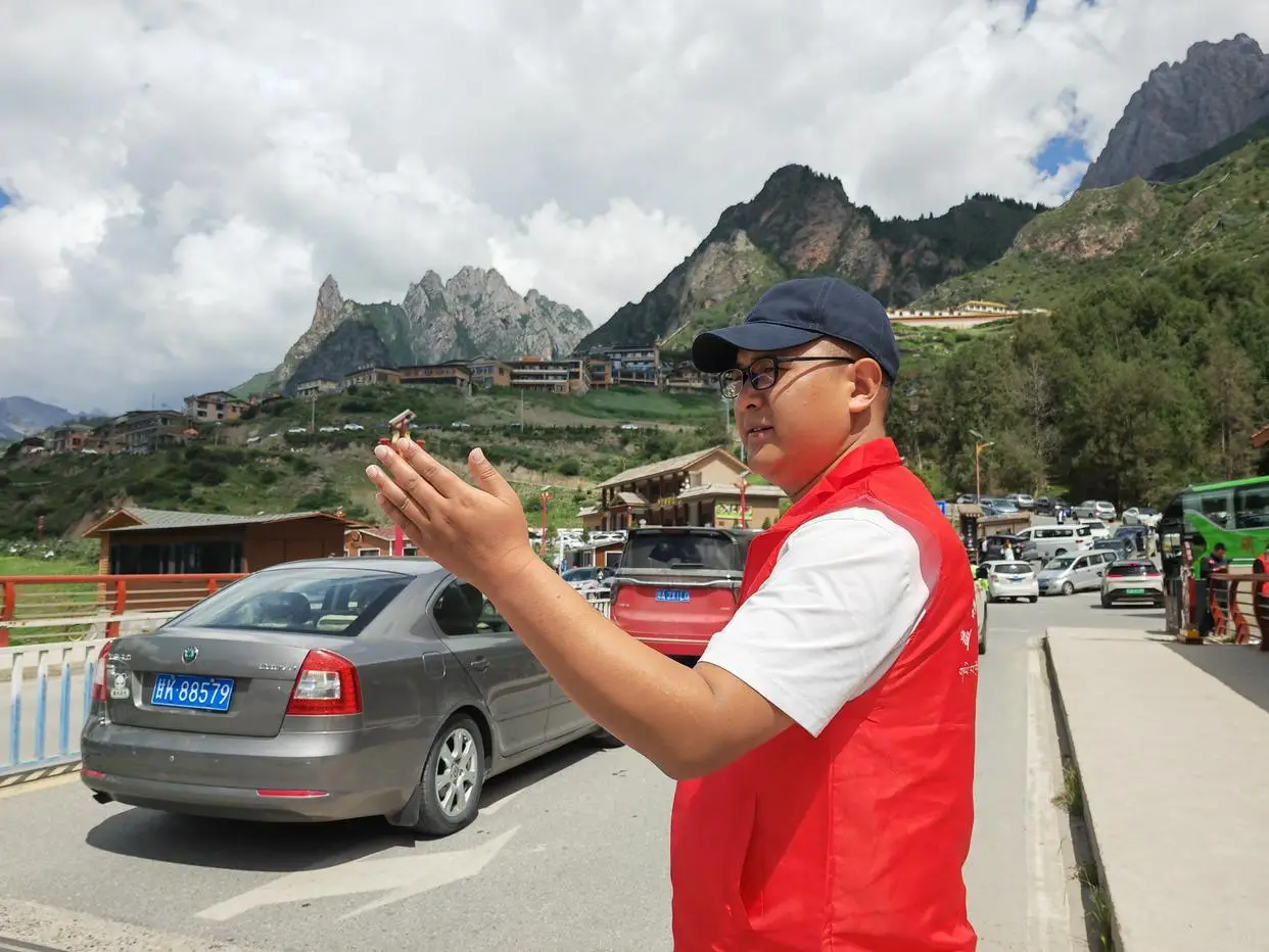 在人来人往的景象中,一群身穿红色马甲的人们正忙碌穿梭。他们负责指挥交通、进行义务解说、协助游客解决旅途中的各种矛盾,只要有需求,他们便会出现在那个地方。扎尕那村的党支部书记班代交就是这其中的一个。