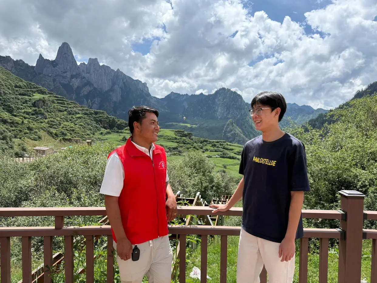道杰东主,位于照片左侧者,正与游客进行着愉快的对话。(新华社记者贺晋摄影)苑恒,来自河北,化名使用,今年19岁,正准备踏入大学校园开启新的学习旅程。他利用暑假时间,与家人一起来到了扎尕那游玩,这里的独特风光令他不禁赞叹我国山河的雄伟与秀美。