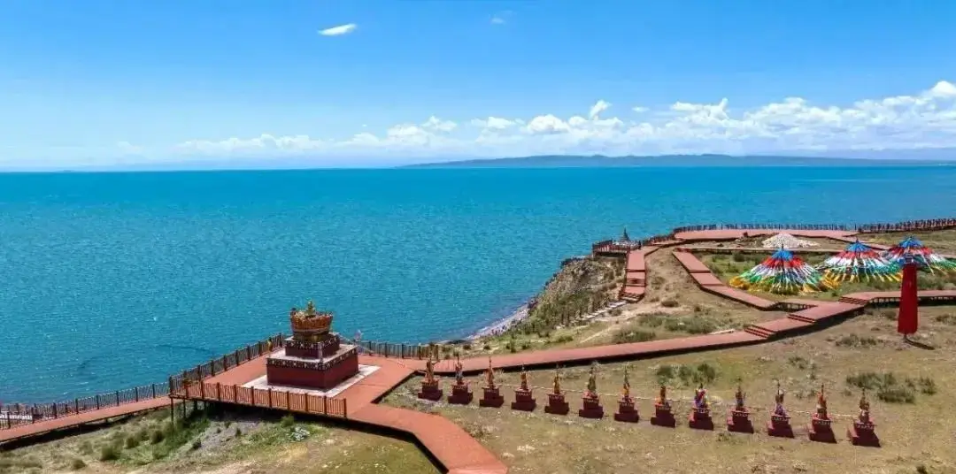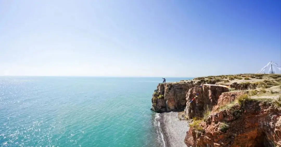 圣泉湾断崖观景台位于青海湖旅游区,是游客离湖水最近的景点之一。游客沿着栈道可以抵达湖边,近距离感受青海湖的清凉。在这里,他们还有机会在湖边湿地喂食海鸥、骑乘牦牛,享受独特的乐趣。