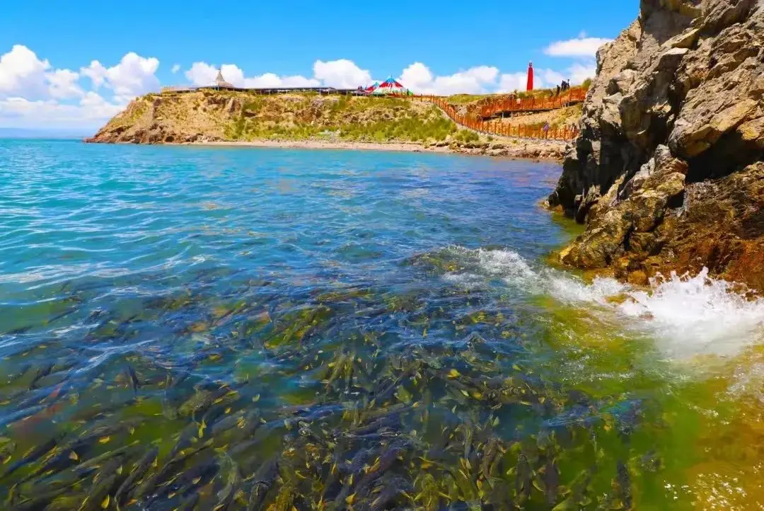 圣泉湾是观赏青海湖裸鲤与海鸥同游的绝妙去处,湖畔常常可见成群的裸鲤密集聚集,它们与游客们互动嬉戏,形成了一幅“湖水与鱼各占一半”的奇异景观。